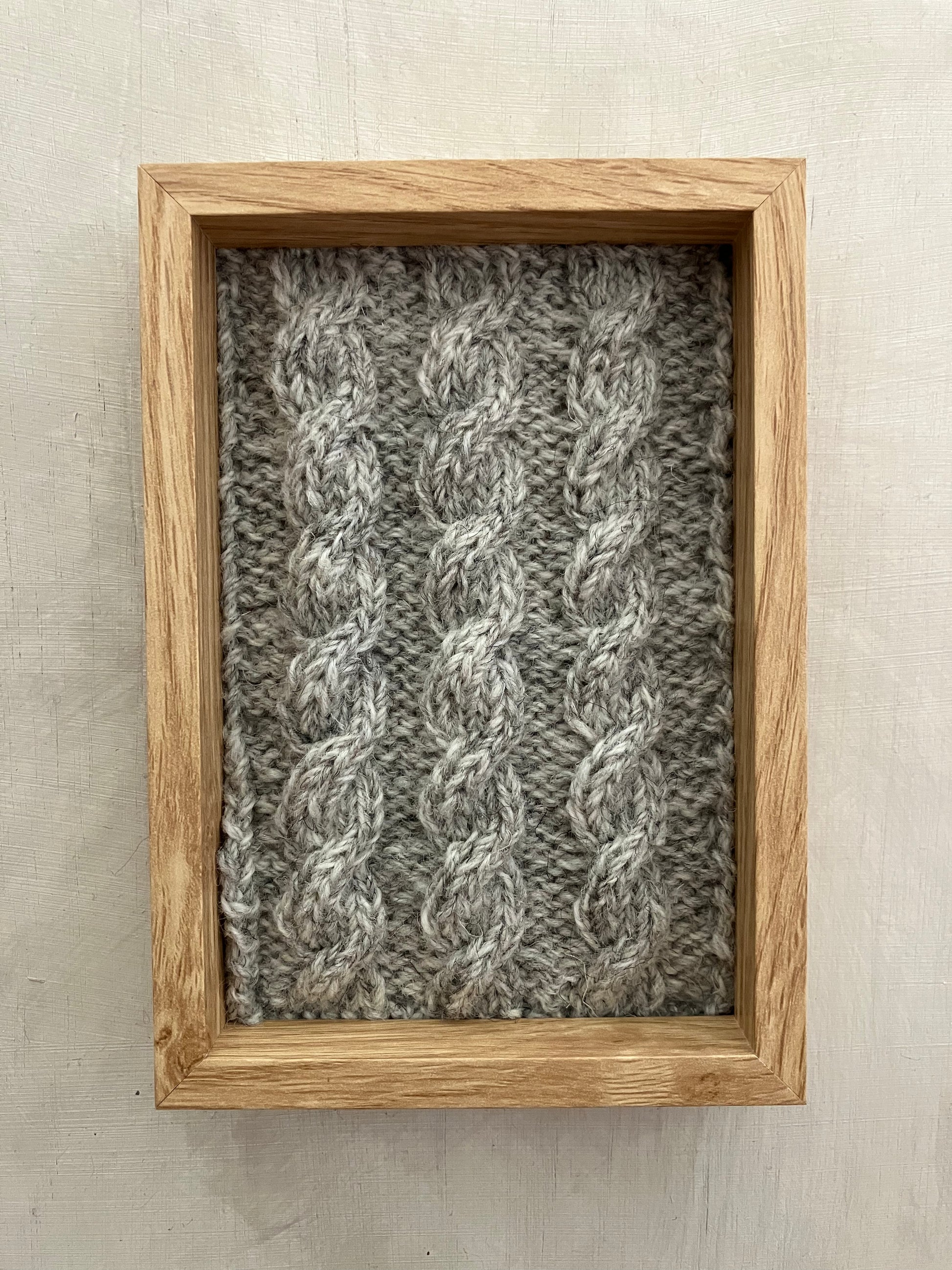 Each piece has been hand knitted in classic Aran stitches using 100% wool, sourced from Kerry Woollen Mills, Studio Donegal Yarns, and Galway Wool Co-op. The panels have been stitched to heavyweight paper then mounted in an FSC approved picture frame.