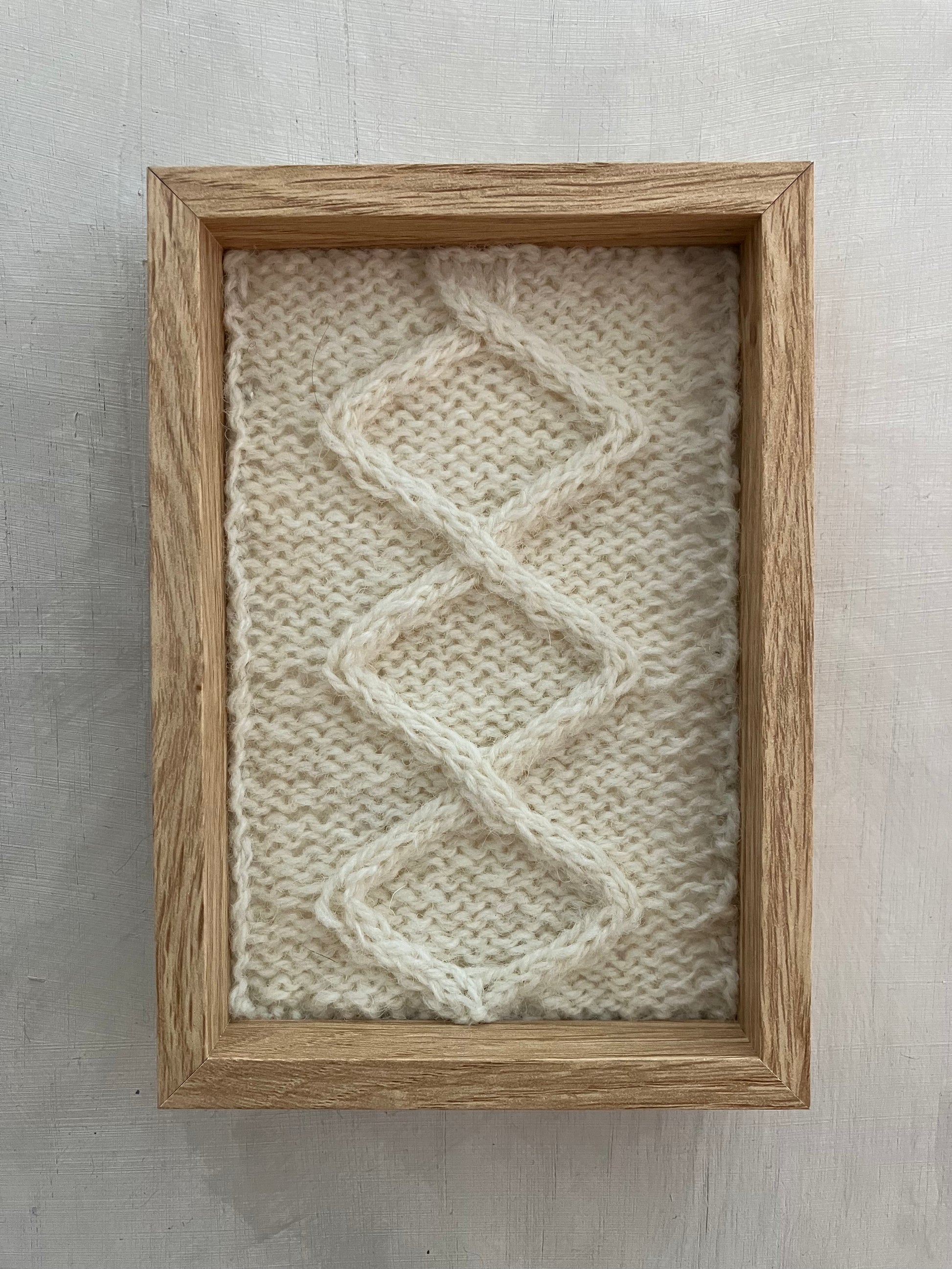 Each piece has been hand knitted in classic Aran stitches using 100% wool, sourced from Kerry Woollen Mills, Studio Donegal Yarns, and Galway Wool Co-op. The panels have been stitched to heavyweight paper then mounted in an FSC approved picture frame.