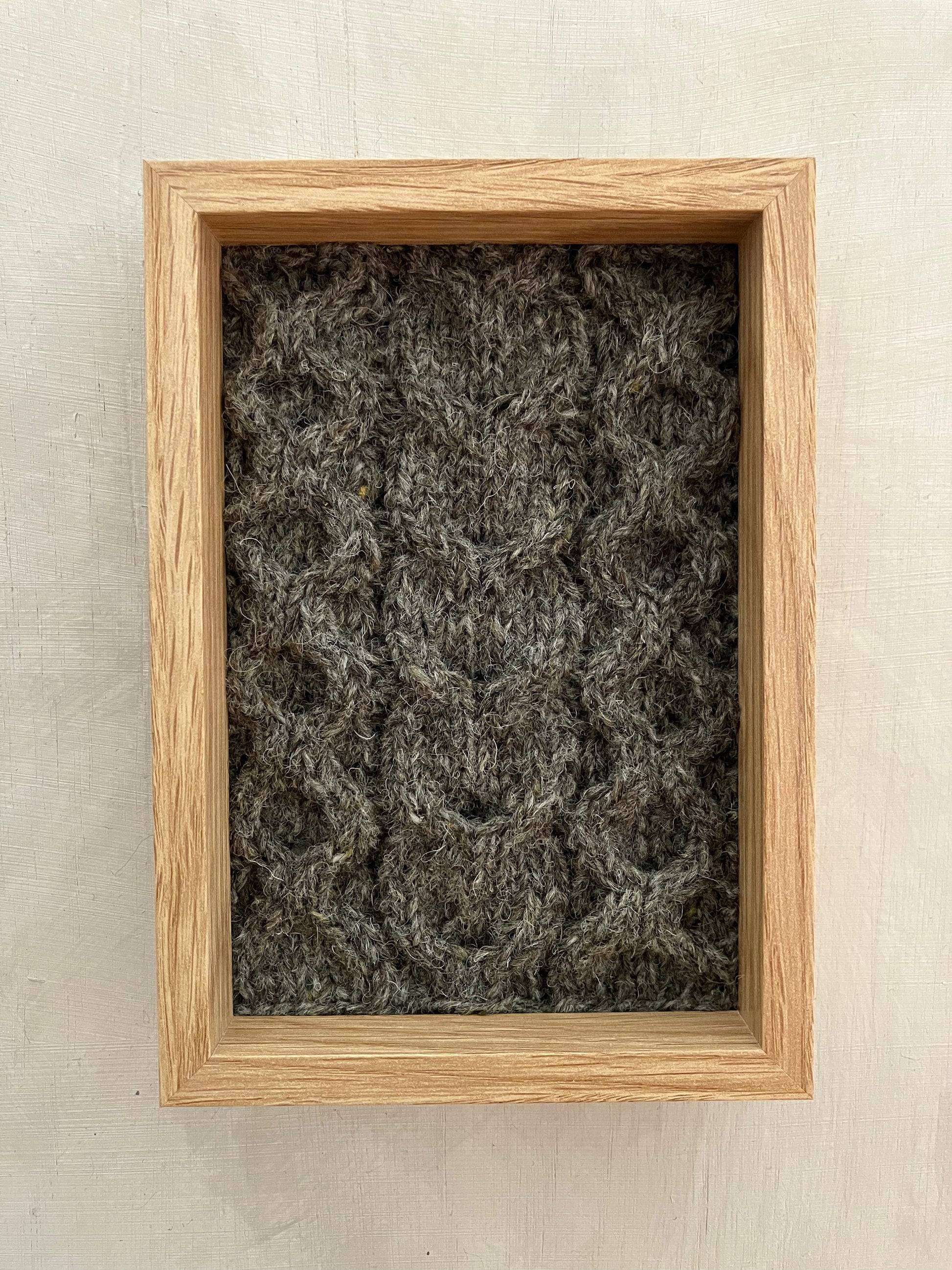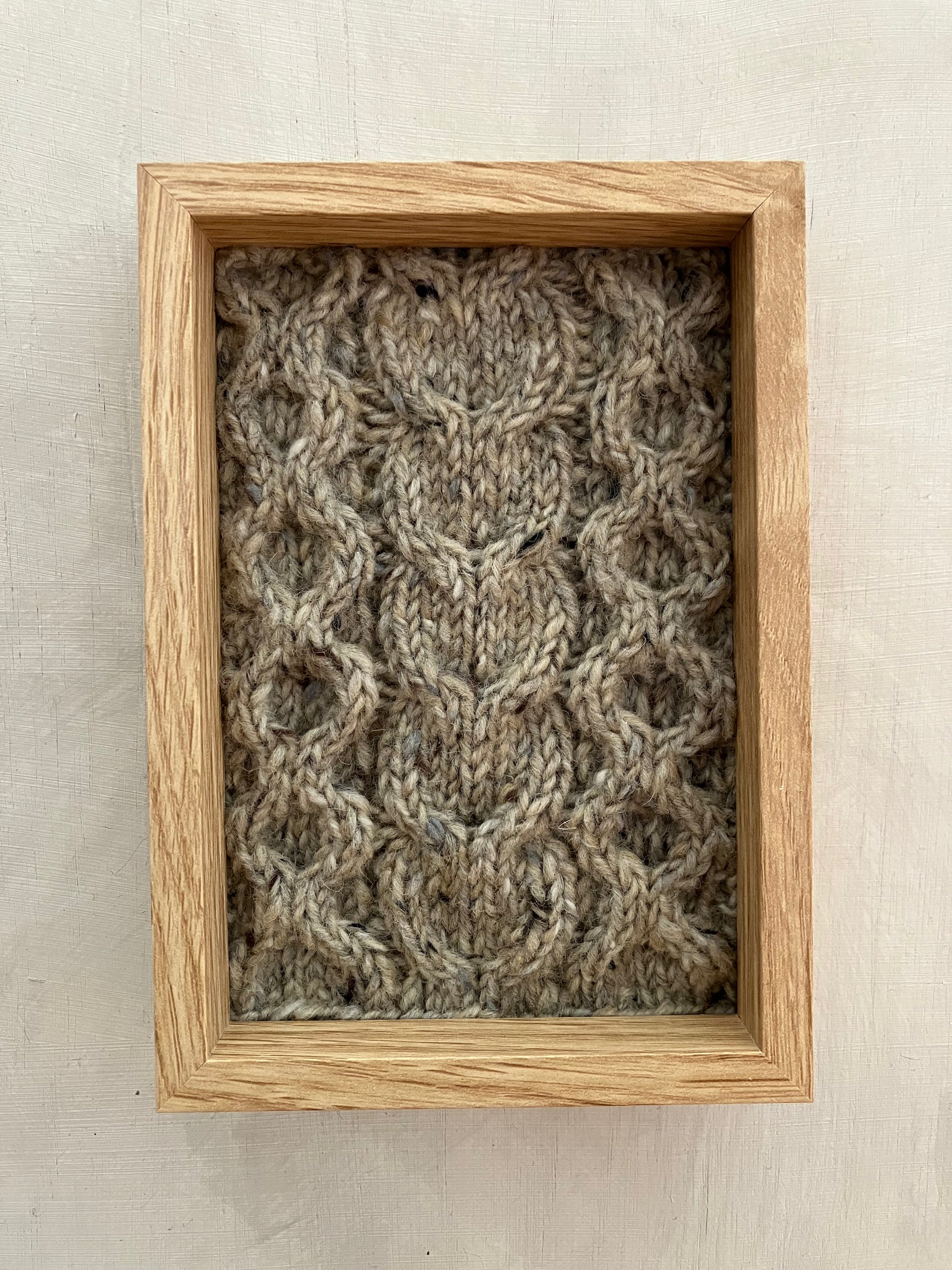 Each piece has been hand knitted in classic Aran stitches using 100% wool, sourced from Kerry Woollen Mills, Studio Donegal Yarns, and Galway Wool Co-op. The panels have been stitched to heavyweight paper then mounted in an FSC approved picture frame.